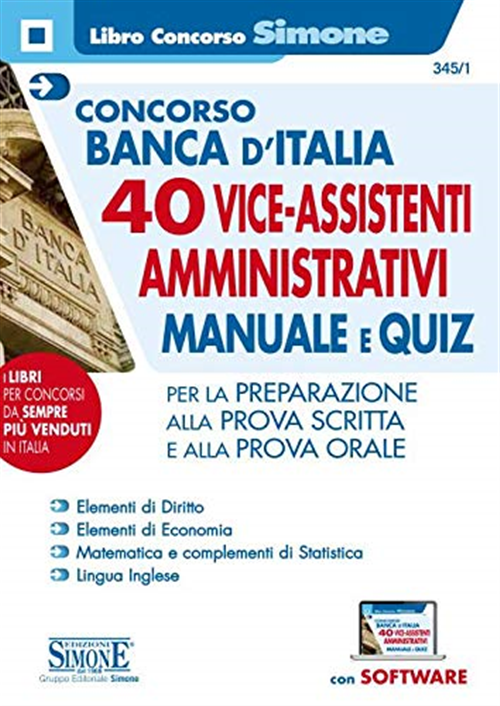 Con bando pubblicato nella G.U. 6-3-2020, n. 19, la Banca d'Italia ha indetto un concorso per 40 Vice assistenti di profilo amministrativo. Questo Manuale, costruito seguendo il programma del bando, costituisce, pur nella sua impostazione sintetica, una valida base per prepararsi alle prove d'esame. In particolare, il testo presenta trattazione teorica e quiz a risposta multipla, alcuni dei quali tratti da quelli ufficiali somministrati nei precedenti concorsi, relativi alle seguenti materie: Elementi di Diritto; Elementi di Economia; Matematica e complementi di Statistica; Lingua Inglese. Il Manuale, quindi, per com'è strutturato, è utile sia per la prova scritta, basata su quiz a risposta multipla, sia per la prova orale. Il testo presenta inoltre espansioni online di approfondimento e un software per infinite simulazioni della prova scritta.