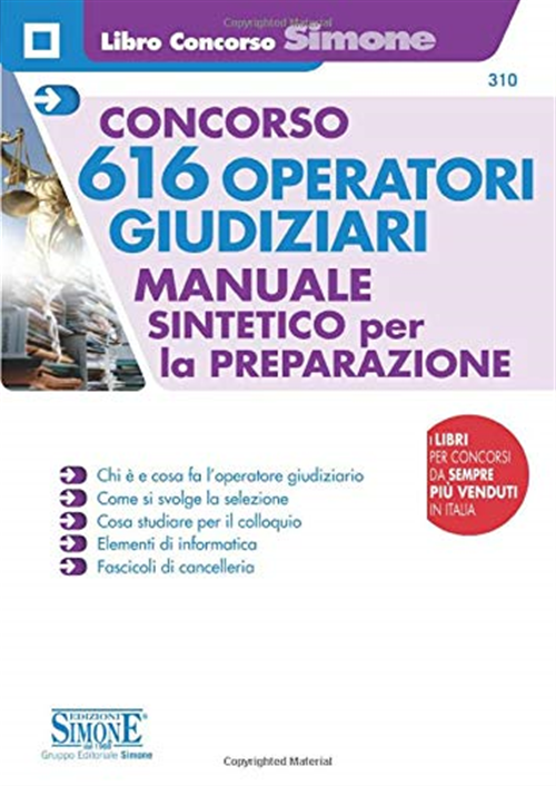 Nella Gazzetta Ufficiale 8-10-2019, n. 80 è stato pubblicato l'avviso del Ministero della giustizia che dà avvio a una selezione per la copertura di 616 posti nel ruolo di Operatore giudiziario. L'assunzione avverrà mediante avviamento degli iscritti ai Centri per l'impiego, scegliendoli tra coloro che sono in possesso del diploma d'istruzione secondaria di primo grado (scuola media). Saranno le Corti di appello di competenza territoriale a svolgere la selezione, che mira ad accertare se il lavoratore è idoneo a svolgere le mansioni previste dal profilo professionale di Operatore giudiziario. La selezione consiste in: un colloquio; una prova pratica d'idoneità. La prova pratica mira a verificare la capacita di riordinare fascicoli cartacei e il possesso delle nozioni di base nell'uso di computer e dei sistemi informatici (utilizzo di programmi di videoscrittura e della posta elettronica, capacità di navigazione sulla rete Internet ecc.). Questo testo, dunque, va incontro alle esigenze di coloro che sono candidabili a sostenere la selezione ed è così strutturato: Parte I. Guida alla selezione per operatori giudiziari, in cui viene spiegato passo per passo il contenuto del bando e si forniscono consigli utili su come affrontare il colloquio. Infine, sono esaminati i fascicoli di cancelleria e i modi in cui si riordinano; Parte II. Elementi base di informatica, in cui viene analizzato e mostrato tutto ciò che serve per usare al meglio un computer, gestire la posta elettronica e navigare in Internet.