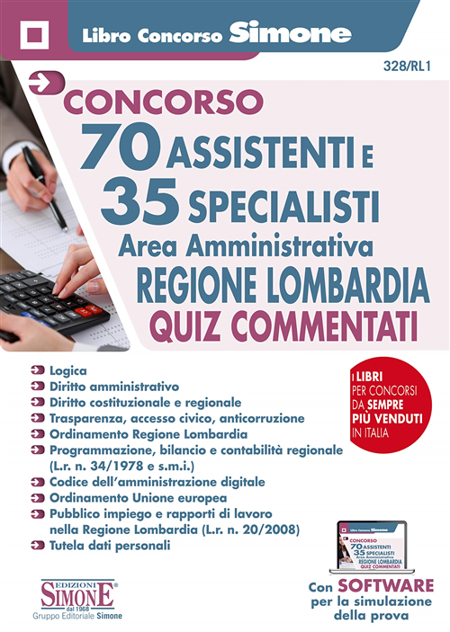 Il libro "70 assistenti e 35 specialisti. Area amministrativa. Regione Lombardia. Quiz commentati" s'indirizza a coloro che devono prepararsi alla prova scritta prevista dalle procedure concorsuali indette dalla Regione Lombardia per i seguenti profili professionali da inserire presso la Giunta regionale: 35 specialisti area amministrativa; 70 assistenti area amministrativa. In particolare, il manuale contiene migliaia di quiz a risposta multipla commentati sulle seguenti materie: diritto costituzionale e regionale, con particolare riferimento all'assetto delle competenze secondo il Titolo V della Costituzione; Statuto d'autonomia della Lombardia; rapporti tra l'ordinamento dell'Unione europea e l'ordinamento interno, con riferimento, in particolare, al sistema delle fonti del diritto; ordinamento del lavoro nelle pubbliche amministrazioni; Testo unico in materia di organizzazione e di rapporti di lavoro nella Regione Lombardia (L.r. n. 20/2008); diritto amministrativo, con particolare riferimento al procedimento amministrativo, disposizioni in materia di documentazione amministrativa e contratti pubblici; trasparenza, accesso civico semplice e generalizzato, prevenzione della corruzione; tutela dei dati personali; programmazione, bilancio e contabilità regionale (L.r. n. 34/1978 e s.m.i.); codice dell'amministrazione digitale; test di logica, deduttivi e numerici (questi sono richiesti solo per il concorso per 35 specialisti area amministrativa). Ricordiamo che per i 70 posti area amministrativa la prova potrebbe consistere in quesiti a risposta sintetica: i candidati a questo profilo potranno comunque utilizzare i commenti organici forniti per ciascun quiz di questo libro come modello di risposta. Particolarmente utile ai fini della preparazione è, infine, il software, accessibile tramite QR Code e contenente tutti i quiz presenti nel testo, con cui cimentarsi in infinite simulazioni della prova.