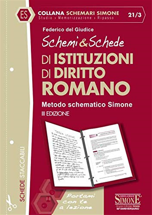 I volumi Schemi&Schede Simone facilitano lo studio e la memorizzazione della materia, in quanto: affiancati alla lettura del testo istituzionale, presentano un quadro riassuntivo della disciplina nonché una schematizzazione dei principali istituti; le pagine possono essere staccate e inserite nel proprio manuale o nel blocco di appunti delle lezioni; sollecitando anche la memoria visiva, ottimizzano i tempi di apprendimento e ripasso riducendoli di almeno il 30%. Schemi&Schede sono preziosi anche prima di entrare in aula: se dai una rapida lettura all'argomento oggetto della lezione, potrai seguirla meglio e potrai prendere appunti molto più completi. Nello studio delle discipline romanistiche, Schemi&Schede si dimostra di particolare utilità anche per quegli studenti che non hanno particolarmente dimestichezza con la lingua latina.