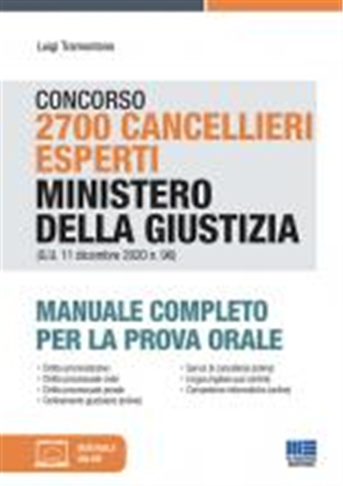 Il manuale è un utile strumento di preparazione alla prova orale del concorso indetto dal Ministero della Giustizia per il reclutamento di 2700 cancellieri esperti, da inquadrare nell'Area funzionale seconda, fascia economica F3 (G.U. 11 dicembre 2020 n. 96). Il bando di concorso prevede di selezionare i candidati attraverso la valutazione dei titoli e, a seguire, con una prova orale sugli argomenti indicati dal bando. Il manuale presenta in maniera chiara e approfondita tutte le materie richieste alla prova orale: diritto amministrativo (con particolare riferimento al procedimento amministrativo, alla disciplina del lavoro pubblico, alle diverse responsabilità dei dipendenti pubblici, alla disciplina degli appalti, al codice del processo amministrativo); diritto processuale civile; diritto processuale penale; ordinamento giudiziario; servizi di cancelleria. Nella sezione online collegata al libro, disponibile seguendo le istruzioni riportate in fondo al libro, saranno presenti anche le sezioni relative alla lingua inglese e alle competenze informatiche, utili per completare la preparazione dei candidati alla prova, oltre ai futuri aggiornamenti normativi. Il testo è aggiornato agli ultimi provvedimenti legislativi (Decreto Cura Italia, Decreto Rilancio, Decreto Agosto, Decreto Semplificazioni, Decreto Sicurezza e immigrazione, Decreto Ristori e Ristori-bis), presentandosi, così, come uno strumento di sicura utilità per la preparazione del candidato.