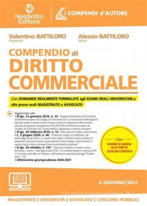 Il "Compendio di diritto commerciale", di Valentino Battiloro e Alessio Battiloro, si inserisce nella collana "I compendi d'autore", destinata a chi si appresta alla preparazione degli esami orali per l'università, per avvocato, per il concorso di magistrato e per i concorsi pubblici. Il volume fornisce una analisi completa e, tuttavia, sintetica e schematica, della disciplina, degli istituti di parte generale e speciale, con segnalazione anche della giurisprudenza più significativa illustrata in appositi Focus. Il Compendio è stato redatto per agevolare una rapida memorizzazione con l'esposizione "per punti" delle principali tesi emerse in dottrina e in giurisprudenza sulle questioni più problematiche: è frequente, inoltre, l'uso di grassetti e corsivi per i concetti-chiave di ogni singolo istituto; consente, infine, di saggiare il livello di preparazione, fornendo, per ciascun capitolo, le domande più probabili e ricorrenti su cui è utile che gli aspiranti avvocati, magistrati, funzionari e dirigenti si esercitino.