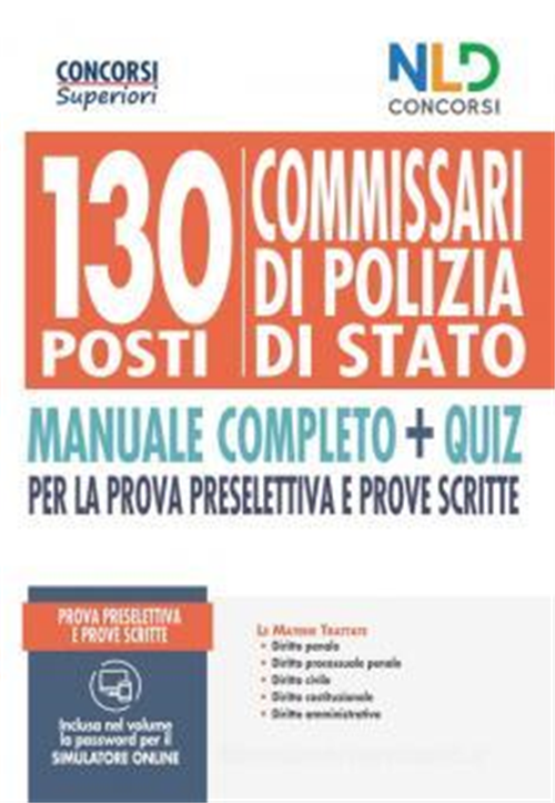 Il presente Manuale, unendo Teoria e Quiz, rappresenta uno strumento utile non solo per apprendere i concetti chiave delle materie di Diritto Amministrativo, Diritto Costituzionale, Diritto Civile, Diritto Penale e Diritto Processuale Penale, ma anche per approfondire e ripassare gli argomenti più richiesti in sede concorsuale e testare la propria preparazione. Infatti, la trattazione chiara ed esaustiva delle materie, aggiornate alle ultime novità legislative, unita all'accurata selezione di quiz divisi per argomento, permette all'aspirante Concorsista di prepararsi sia a sostenere la prova preselettiva che le prove scritte del Concorso per 130 posti di Commissario di Polizia di Stato. Inoltre, il volume offre, tramite la password presente nelle ultime pagine, la possibilità di scaricare gratuitamente le estensioni online contenenti la banca dati ufficiale del precedente concorso pubblico, per titoli ed esami, per il conferimento di 120 posti di commissario - D.C.P. 02/12/2019, e le relative tracce delle prove scritte estratte e non. La stessa password consente l'accesso al simulatore online, ed ai quiz divisi per materia, che permetteranno al candidato di continuare a testare e rafforzare la sua preparazione.