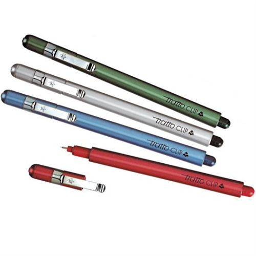Penna punta ad ago "Made in Italy" con inchiostro a base acqua. Corpo metallizzato e tubetto di sostegno e clip in acciaio inox.