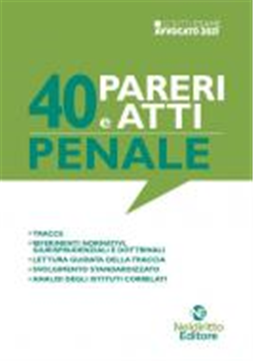 Raccolta ragionata di 40 pareri di Penale per la preparazione all'esame di Avvocato 2021 Nel volume sono state identificate e, quindi, trattate le questioni più attuali e dibattute in giurisprudenza, attraverso un inquadramento semplice e schematico degli istituti e l'esposizione degli orientamenti giurisprudenziali. Per ogni questione, è elaborata una traccia d'esame, in relazione alla quale si propone al lettore lo svolgimento sia dell'atto giudiziario che del parere. Ogni argomento, inoltre, è affrontato con specifico riferimento ad una sentenza recente di legittimità, la cui motivazione è riportata per esteso, nell'estensione on line del volume, oltre ad essere accompagnato da una ricognizione della giurisprudenza rilevante, le cui massime sono state utilizzate per la stesura dell'atto giudiziario e del parere. Infine, si è ritenuto di aggiungere un breve inquadramento teorico generale di ogni istituto giuridico affrontato, per guidare il lettore nell'approccio sistematico.
