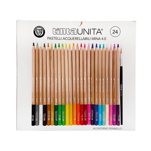 24 Pastelli a colori in legno Tinta Unita con mina da 4mm acquerellabile. Ricca di pigmenti coloranti,colori vivaci,ottima resa,facili da temperare. Una mina ancora più grande per un grande artista! Il massimo della qualità per dare più colore ai tuoi disegni.