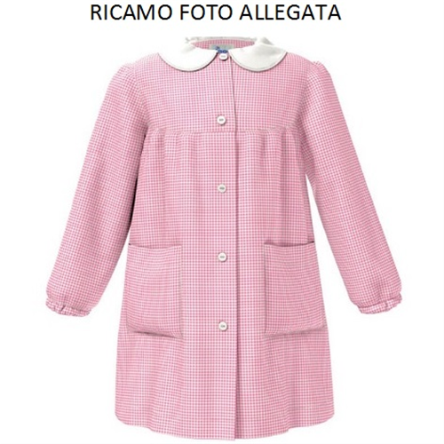Grembiule a quadretti bianchi e rosa, adatto alla scuola dell'infanzia, con maniche lunghe ed elasticizzate sui polsi. Chiusura a bottoni.