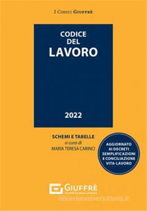 Il Codice del lavoro 2022, include un'ampia e ragionata selezione di provvedimenti, aggiornata ai più recenti interventi legislativi che hanno inciso su diversi aspetti della materia giuslavorista, in particolare, tra le tante: l'introduzione del nuovo assegno unico e universale per i figli a carico che sostituisce le precedenti forme di sostegno economico, tra cui assegni familiari, detrazioni; la concessione dell'esercizio della libertà sindacale ai militari; nuove disposizioni in materia di assunzione di lavoratori stranieri, nonché semplificazione del ricorso al Lavoro Agile da parte delle aziende, i nuovi contenuti dei contratti di assunzione, in attuazione della direttiva della Unione europea n. 2019 / 1152 in materia di condizioni di lavoro trasparenti e prevedibili. Tra i provvedimenti più recenti, cui il codice è aggiornato, si segnalano: l. 4 agosto 2022, n. 122, di conversione del d.l. n. 73/2022 [semplificazioni fiscali e rilascio del nulla osta al lavoro]; d.lgs. 3 agosto 2022, n. 114 [prodotto pensionistico individuale paneuropeo - pepp]; d.lgs. 30 giugno 2022, n. 105 [decreto "conciliazione vita-lavoro"]; d.lgs. 27 giugno 2022, n. 104 [decreto "trasparenza"]; d.lgs. 17 giugno 2022, n. 83 [modifiche al codice della crisi d'impresa e dell'insolvenza]; l. 5 maggio 2022, n. 53 [statistiche in tema di violenza di genere]; l. 28 aprile 2022, n. 46 [libertà sindacale del personale delle forze armate e delle forze di polizia]; l. 7 aprile 2022, n. 32 [deleghe al Governo per il sostegno della famiglia]. Per consentirne una più agile consultazione, i provvedimenti, annotati con i testi previgenti di più recente emanazione e con puntuali richiami alla normativa correlata, sono suddivisi in tre macrovoci: le Norme fondamentali, contenenti le norme codicistiche, e le norme del TUE, TFUE e Carta dei diritti; le Norme complementari, che includono le norme di rilievo regolanti i rapporti di lavoro dei settori privato e pubblico, anche di recentissima emanazione; gli Accordi, che racchiudono i protocolli triangolari e gli accordi interconfederali. Il Codice è, inoltre, corredato da Schemi e Tabelle di sintesi relativi a tutti i principali istituti del Diritto del lavoro, interamente integrati e aggiornati alle ultime novità, a cura di Maria Teresa Carinci