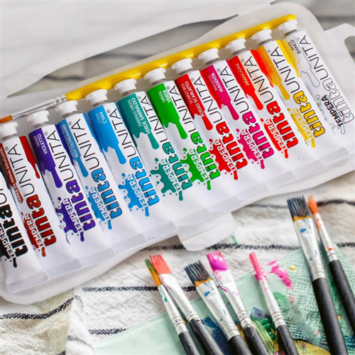 Scatola di tempere TINTAUNITA da 12ml, in tubetti in alluminio. Confezione di 12 colori brillanti, con pennello. Adatto ai bambi