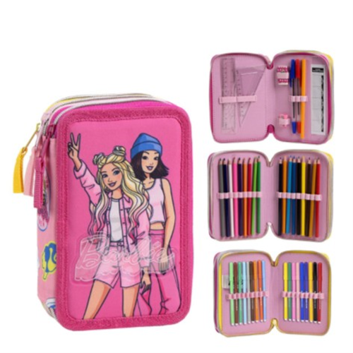 L'astuccio si compone di 3 scomparti, rifinito ognuno con una chiusura a zip, il cui contenuto è così ripartito: nel primo reparto troverete 1 matita, 1 penna Rossa, 1 penna Blu, 1 gomma, 1 temperamatite, 1 righello, 1 squadretta e 1 tabella con lo schema delle ore e dei giorni della settimana in cui poter appuntare l'orario scolastico; nel secondo 18 matite colorate; nel terzo infine 18 pennarelli colorati Giotto Turbo Color.