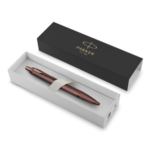 Penna Parker in acciaio inossidabile con finiture mattate burgundy e completata con finiture cromate. Confezionata in elegante astuccio regalo. Fornita con refill colore blu.